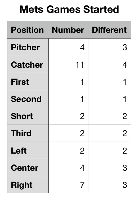 The table below show how many times since 1962 a Mets player has started in an All-Star game by position. The “Different” column indicates how many different players started. For example, though Mets pitchers have been the starters in All-Star games four times, one pitcher (Dwight Gooden) started twice. The other two were Tom Seaver and Matt Harvey.