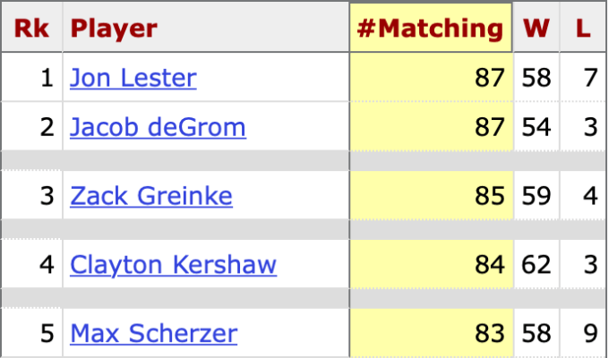 Since deGrom’s career began in 2014, only five MLB starters have pitched more than 80 games in which they surrendered no more than one earned run.
